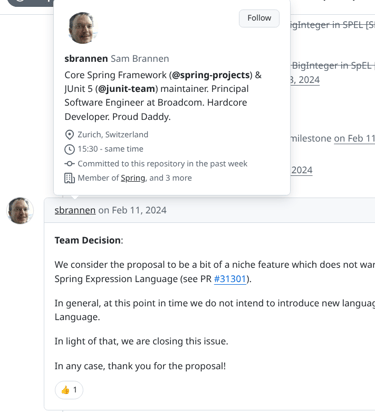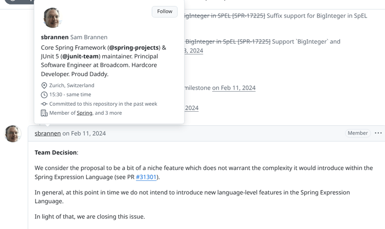 Proposed an enhancement to Spring Expression Language (SpEL) in a Pull Request created in response to user feedback.